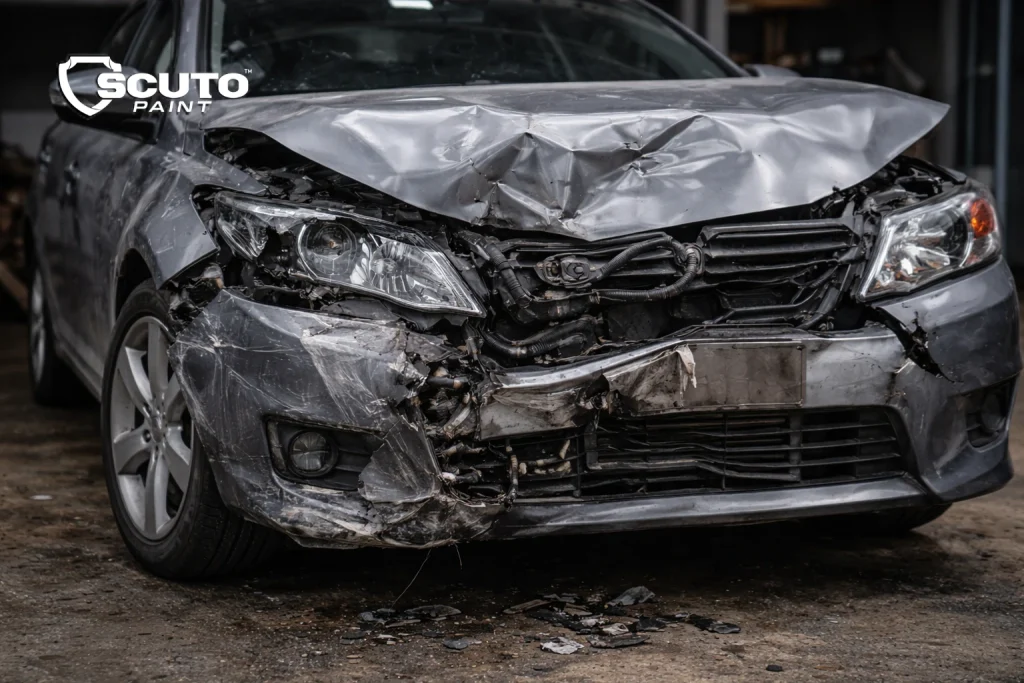 Tabrakan keras sering memengaruhi struktur rangka meski bodi luar terlihat rapi. Inilah sebabnya Scuto Paint selalu melakukan pengecekan struktur sebelum pengecatan.